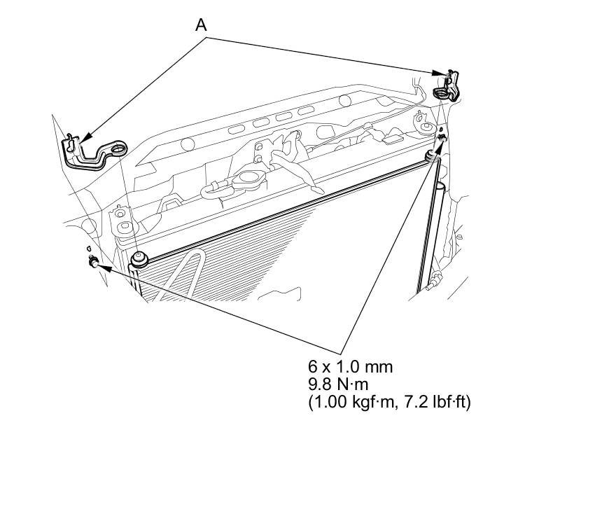 7. Loosen the bolts, then remove the A/C condenser upper mount brackets (A).