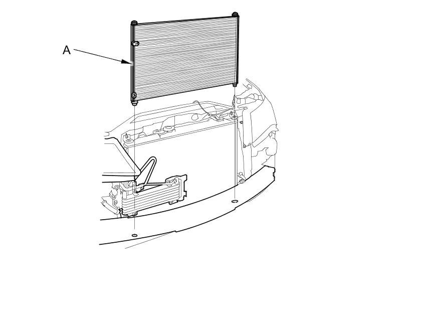 9. Remove the A/C condenser (A) by lifting it up. Be careful not to damage the radiator and A/C condenser fins when removing the A/C condenser.