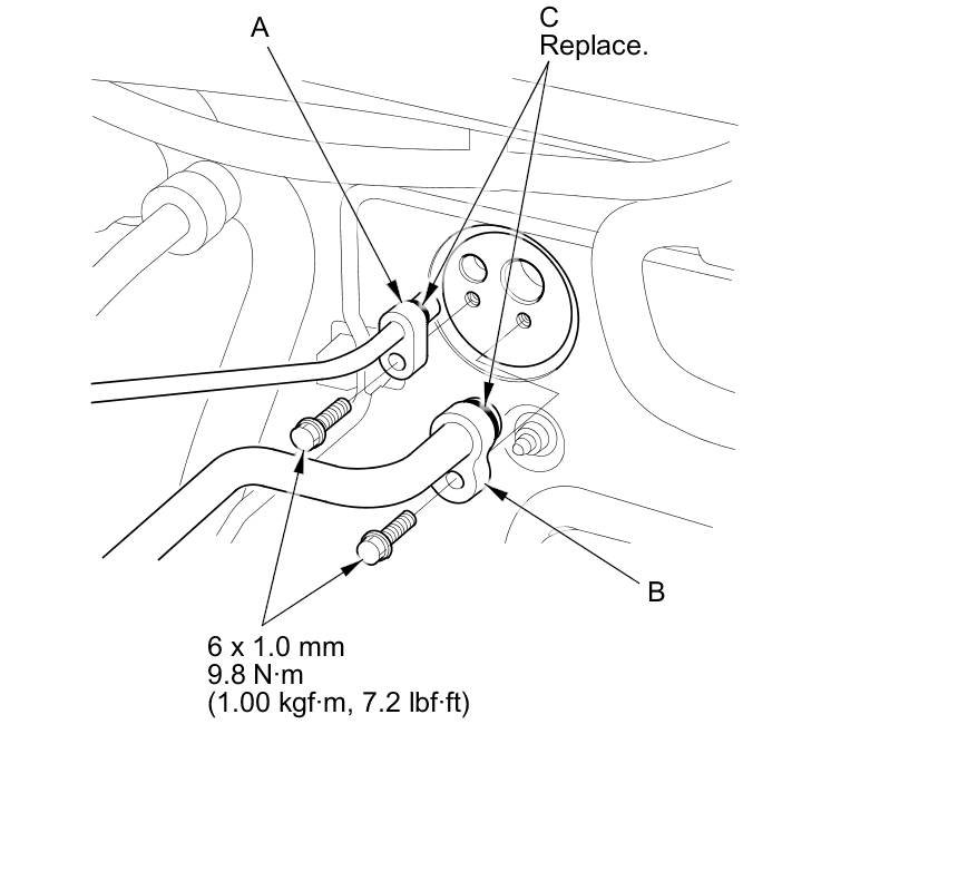 3. Remove the bolts, then disconnect the front receiver line (A) and the front suction line (B) from the front evaporator core. Replace the O-rings (C).