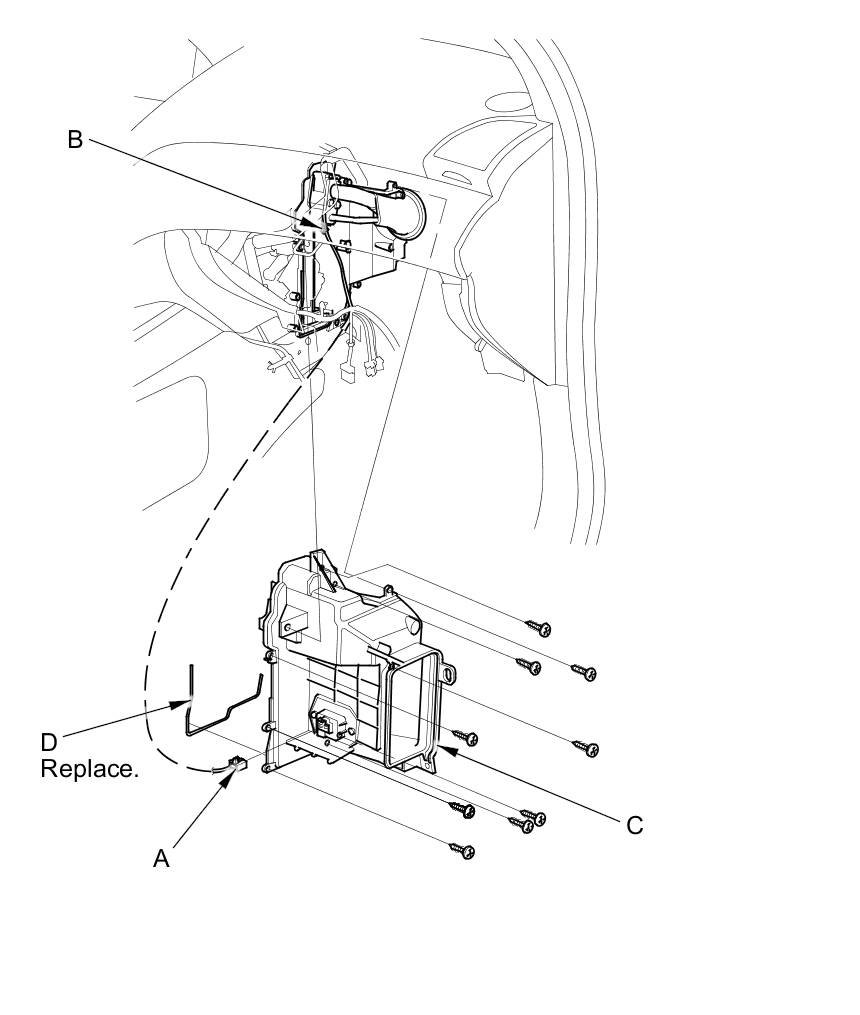 5. Disconnect the connector (A) from the front power transistor, then detach the harness clip (B). Remove the self-tapping screws, the expansion valve cover (C), and the seal (D).