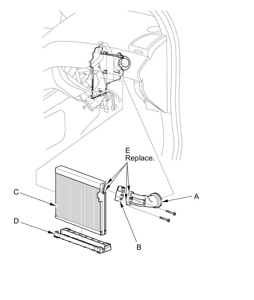 6. Remove the bolts, the inlet and outlet pipes (A), and expansion valve (B). Carefully pull out the front evaporator core (C), then remove the plate (D). Replace the O-rings (E).