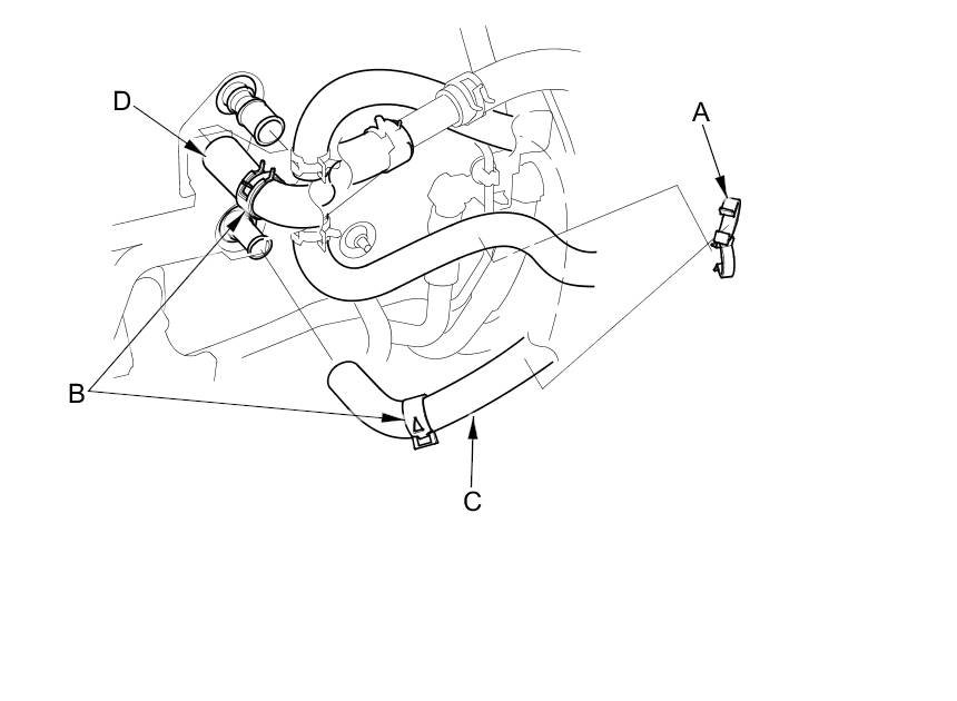 4. Front under the hood, remove the clamp (A). Slide the hose clamps (B) back. Then disconnect the inlet heater hose (C) and the outlet heater hose (D) from the heater unit. Note the layout of the hose.