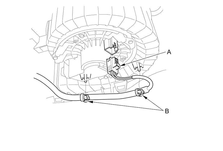 7. Disconnect the connector (A) from the front blower motor. Detach the wire harness clips (B).