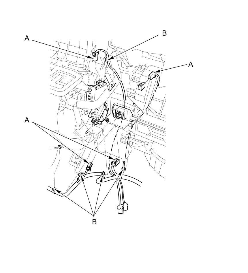 9. Disconnect the connectors (A) from the front mode control motor, the passenger's air mix control motor, the recirculation control motor, and the front power transistor. Detach the wire harness clips (B).
