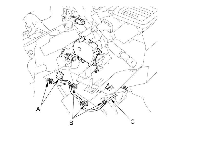 10. Disconnect the connectors (A) from the driver's air mix control motor and the front evaporator temperature sensor. Detach the wire harness clips (B), then remove the wire harness (C).