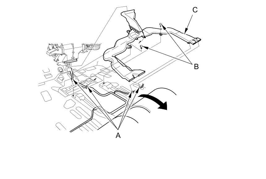 11. Turn over the carpet. Detach the wire harness clips (A) and the rear heater duct mounting clips (B), then remove the rear heater duct (C).