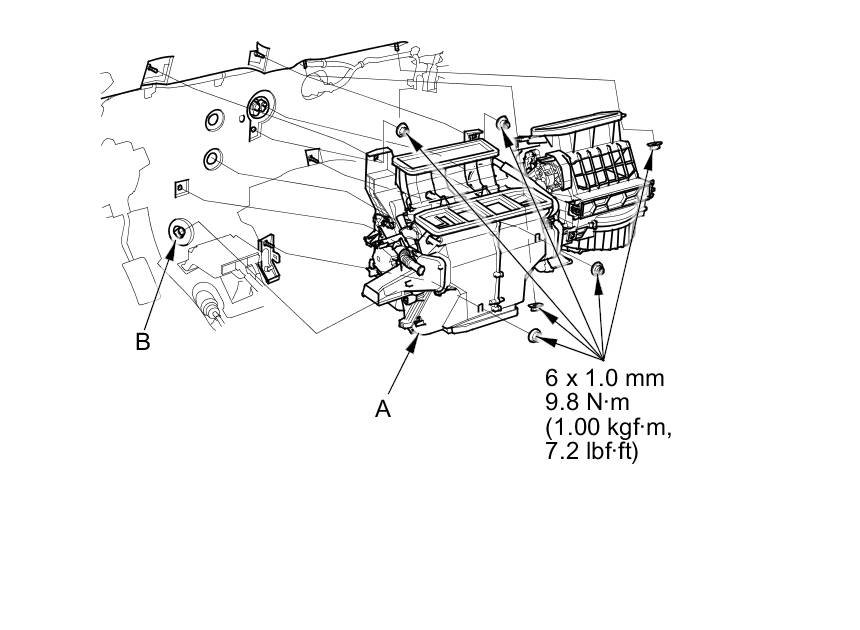 12. Remove the mounting nuts. Slide the blower-heater unit (A), then remove the drain hose (B) and blower-heater unit.