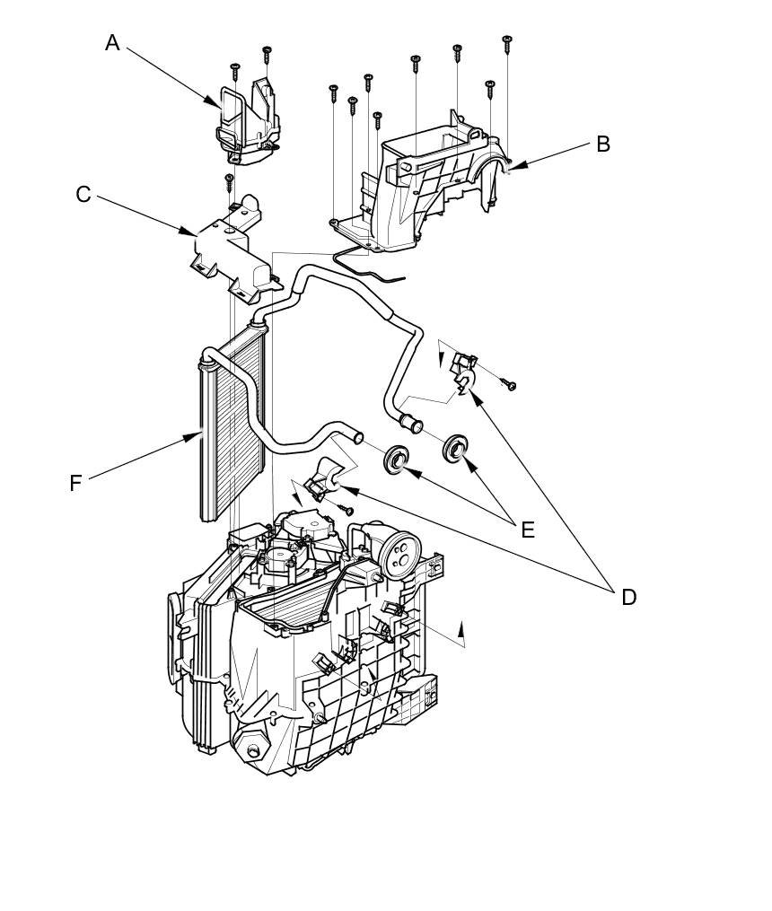13. Remove the self-tapping screws and the passenger's heater duct (A). Remove the self-tapping screws and the expansion valve cover (B). Remove the self-tapping screw and the front heater core cover (C). Remove the self-tapping screws, the heater pipe brackets (D), the grommets (E), and carefully pull out the front heater core (F).