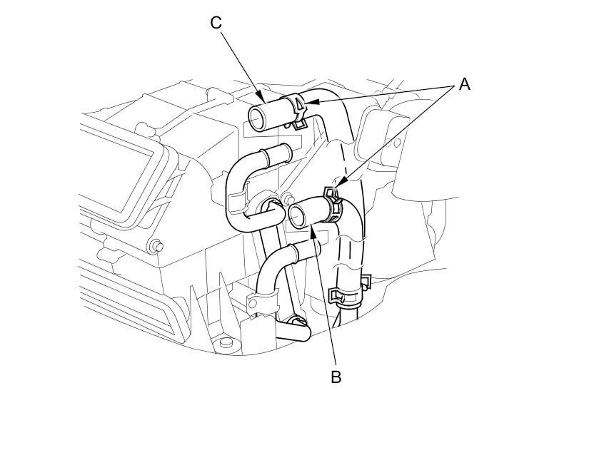 3. Slide the hose clamps (A) back, then disconnect the rear inlet heater hose (B) and the rear outlet heater hose (C) from the rear heater core. Note the layout of the hose.