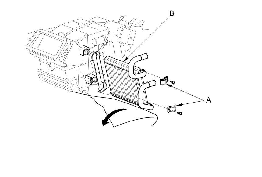 4. Turn over the carpet. Remove the self-tapping screws and the clamps (A). Carefully pull out the rear heater core (B) without bending lines.
