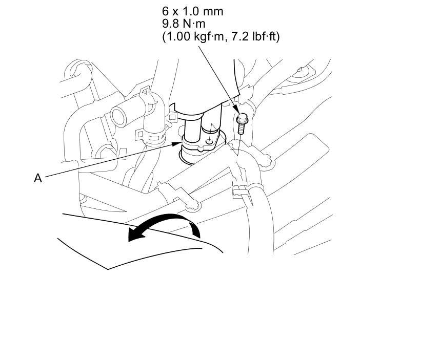 5. Turn over the carpet. Remove the bolt, then disconnect the rear suction/receiver lines (A).