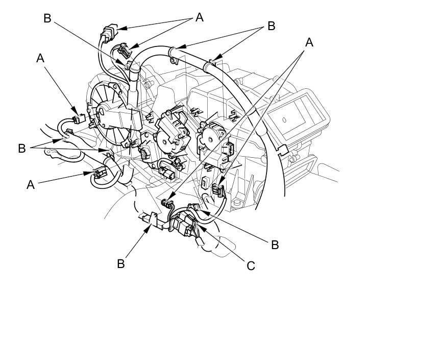 7. Disconnect the connectors (A) from the rear mode control motor, the rear air mix control motor, rear evaporator temperature sensor, rear power transistor, and rear blower motor, then detach the harness clips (B) and connector clip (C).