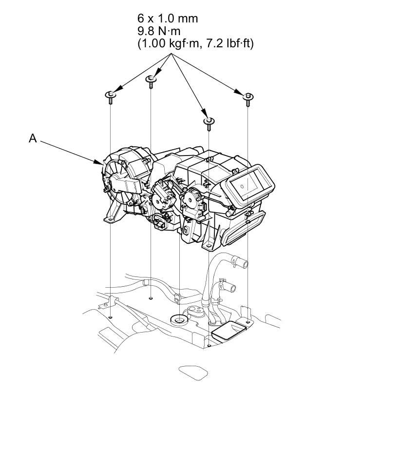 8. Remove the mounting bolts and rear HVAC unit (A). Plug or cap the lines immediately after disconnecting them to avoid moisture and dust contamination.