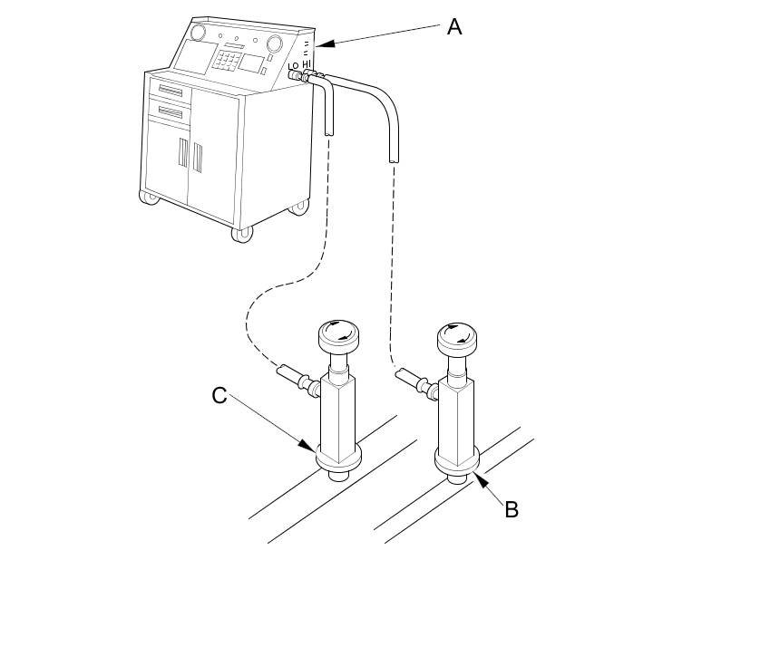 2. Connect an R-134a refrigerant recovery/recycling/charging station (A) to the high-pressure service port (B) and the low-pressure service port (C), as shown, following the equipment manufacturer's instructions.