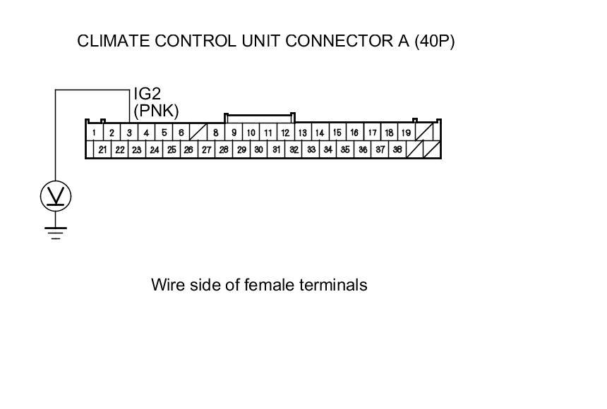 3. Measure the voltage between climate control unit connector A (40P) terminal No. 3 and body ground.