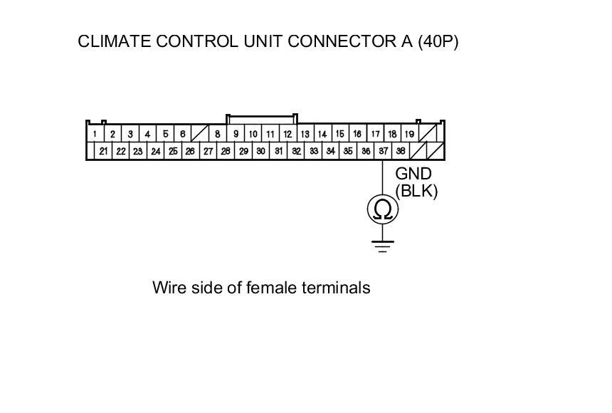 5. Check for continuity between climate control unit connector A (40P) terminal No. 37 and body ground.