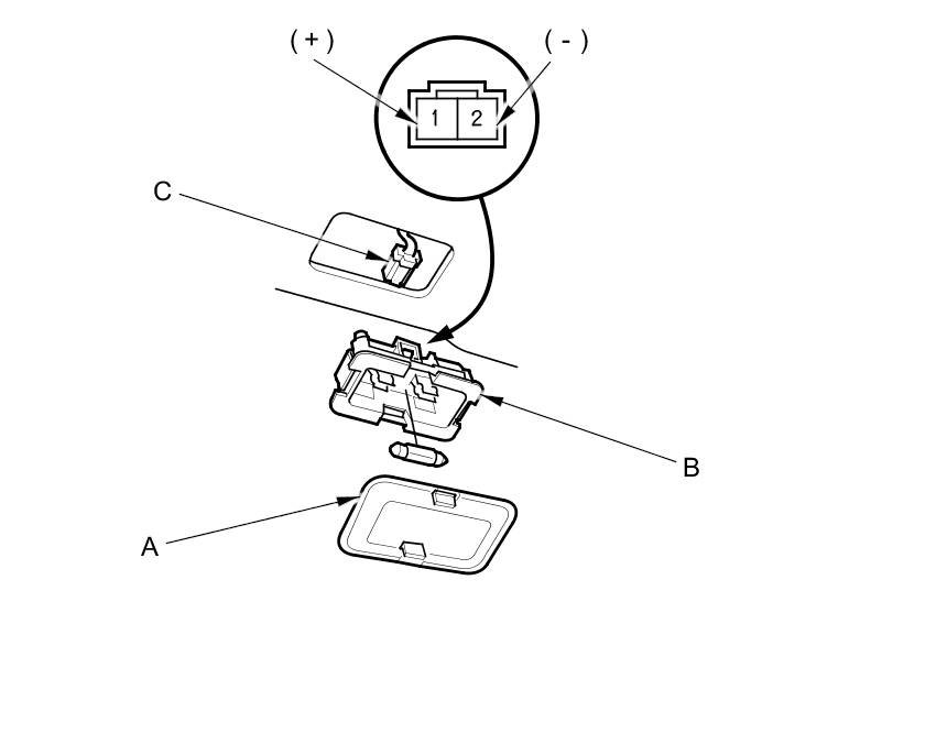 Check for continuity between terminals No. 1 (+) and No. 2 (-). There should be continuity. If there is no continuity, check the bulb (C). If the bulb is OK, replace the footwell light.