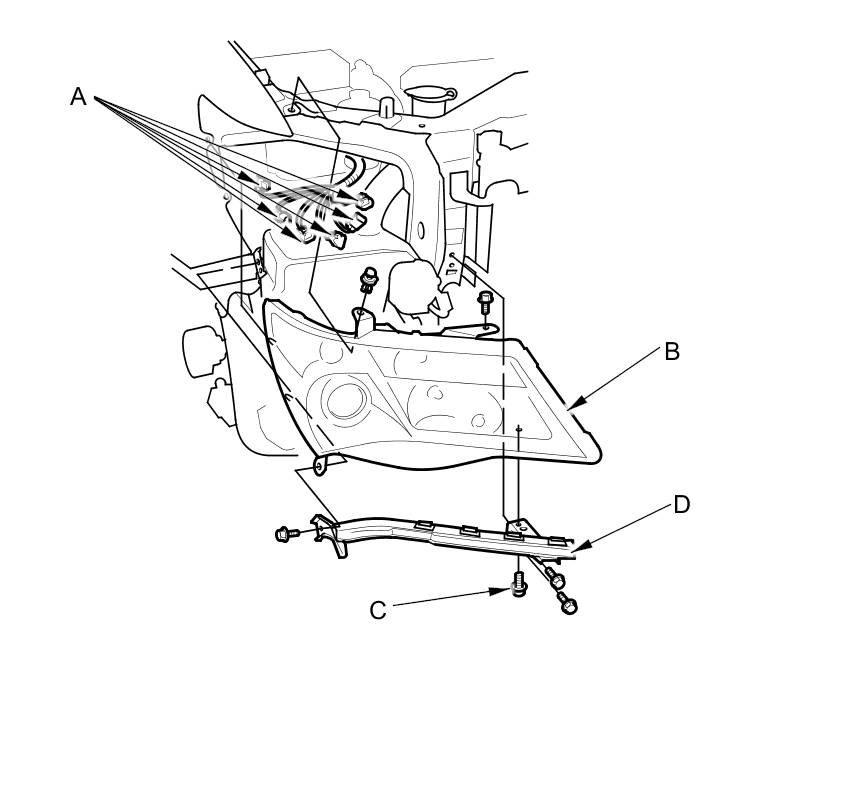 4. Remove the bolt (C) and the corner upper beam (D) from the headlight.