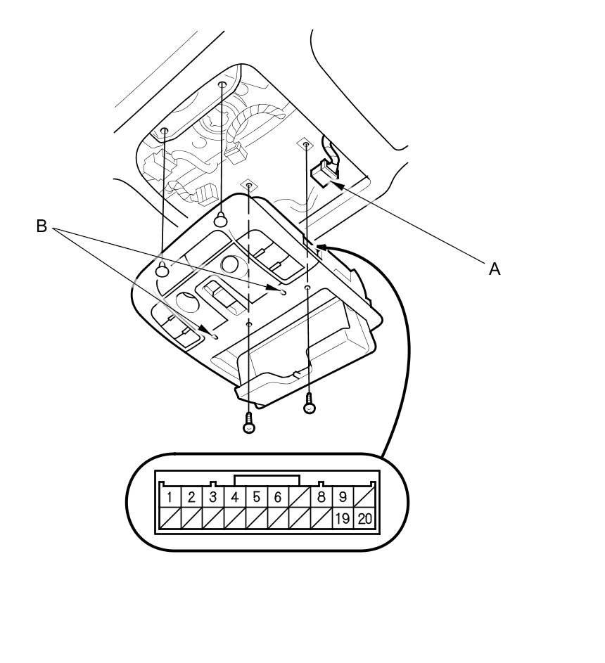 Interior Lights (Roof Console) Input Test/Replacement and disconnect the 20P connector (A).
