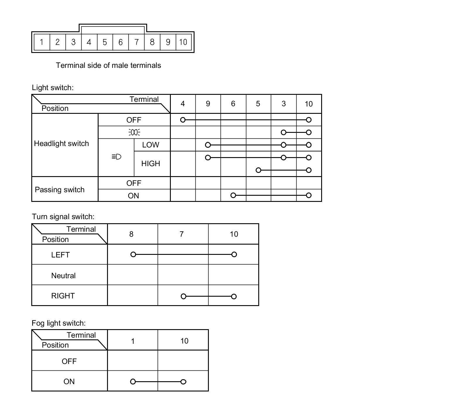 - If the terminals look OK, check for continuity between the terminals in each switch position according to the tables.