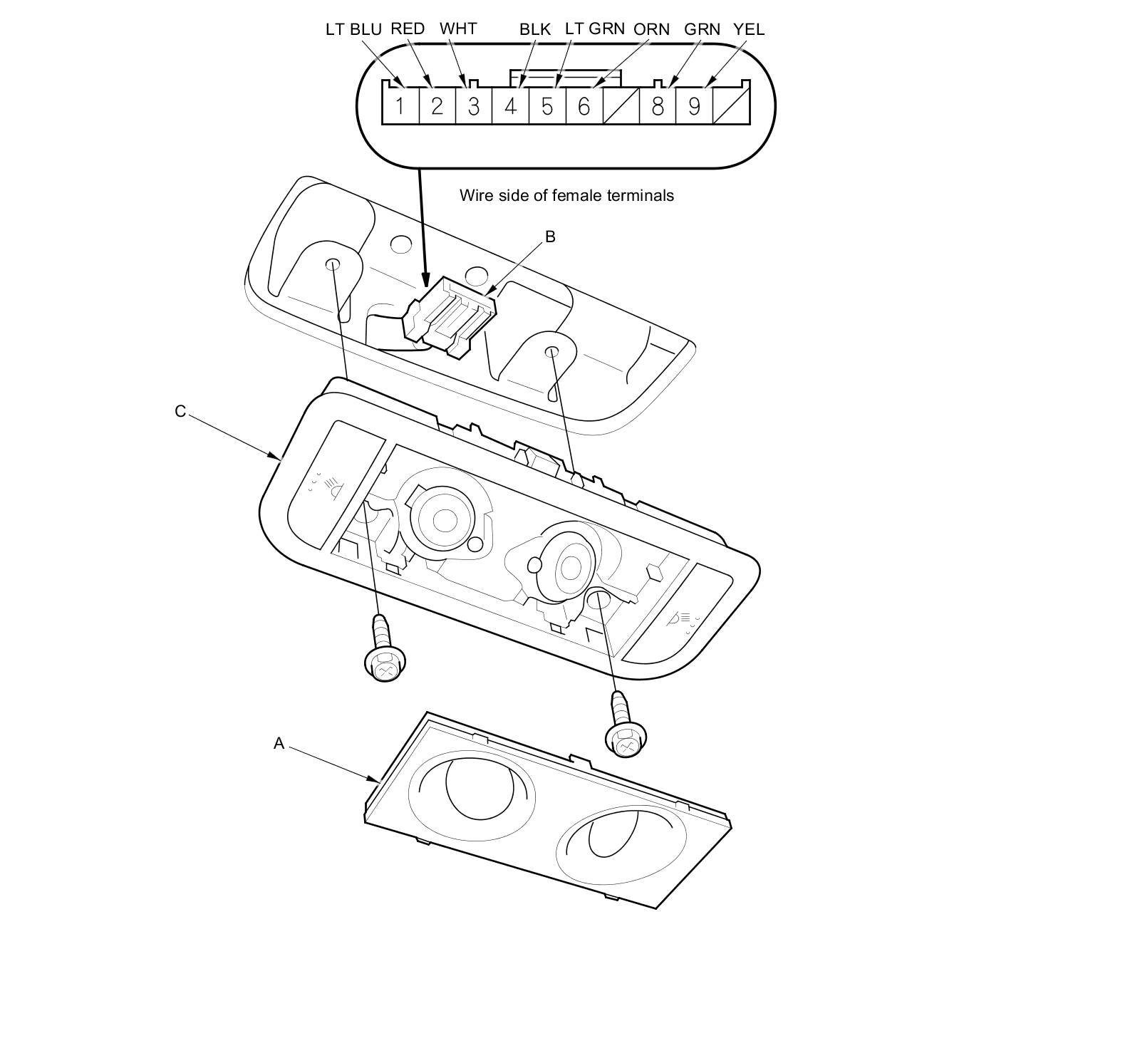 3. Disconnect the 10P connector (B) from the rear individual map light (C).