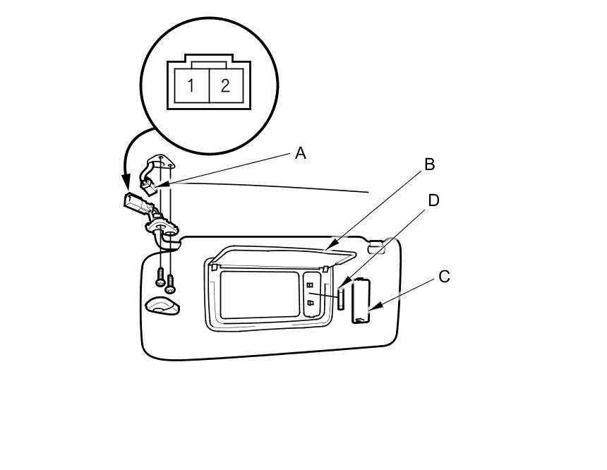 5. If the continuity is not as specified, remove the lens (C) and replace the bulb (D) or the sunvisor.
