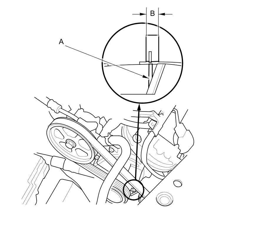 2. Check that the auto-tensioner indicator (A) is within the standard range (B) as shown. If it is out of the standard range, replace the drive belt Service and Repair.
