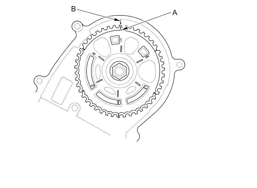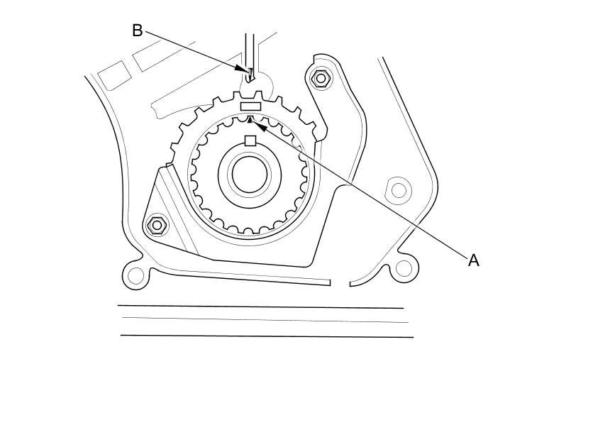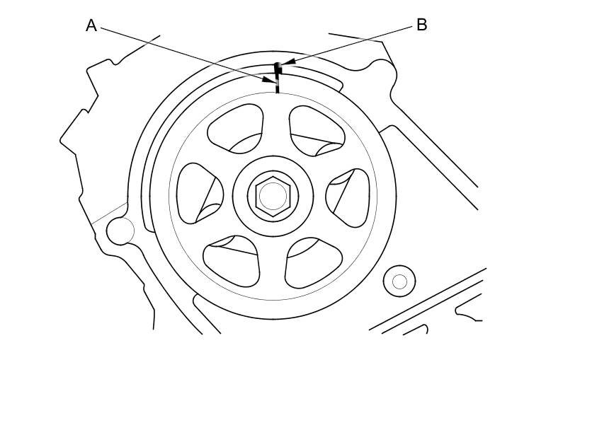 2. Set the timing belt drive pulley to top dead center (TDC) by aligning the TDC mark (A) on the tooth of the timing belt drive pulley with the pointer (B) on the oil pump.