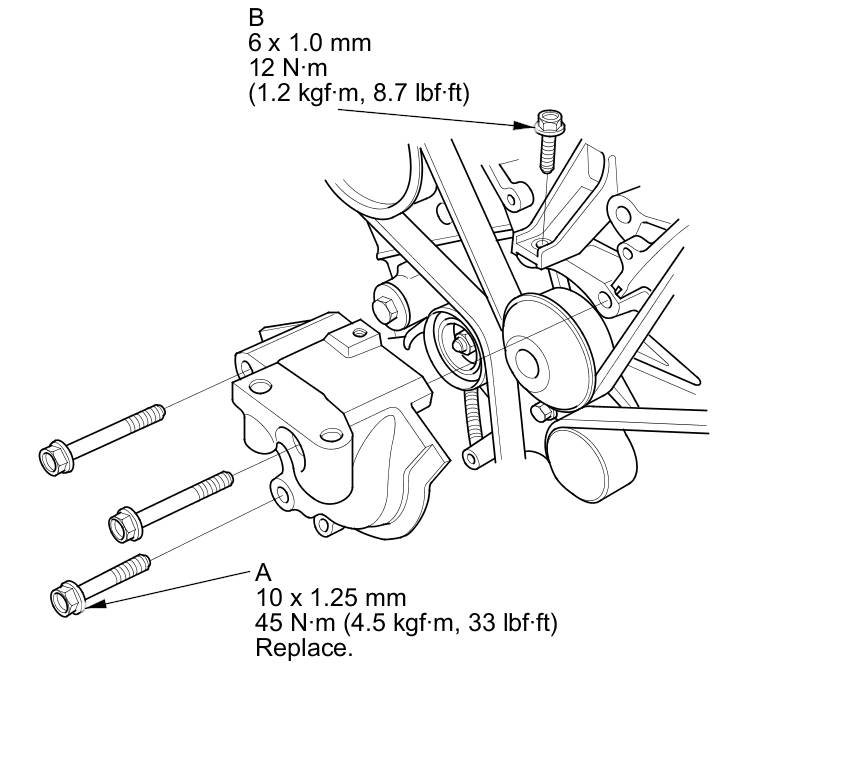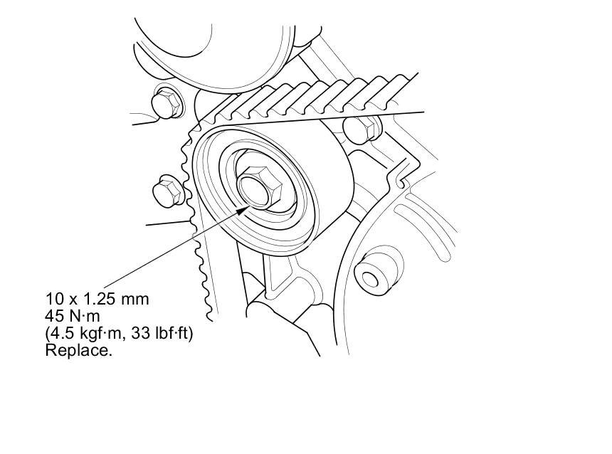 7. Install a new idler pulley bolt and tighten it to the specified torque.