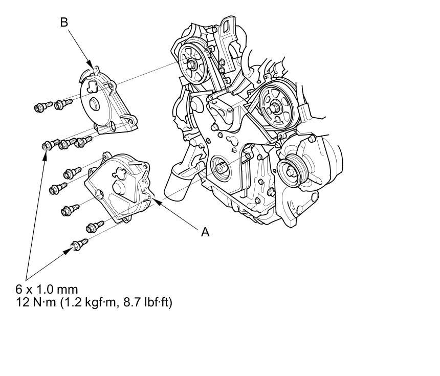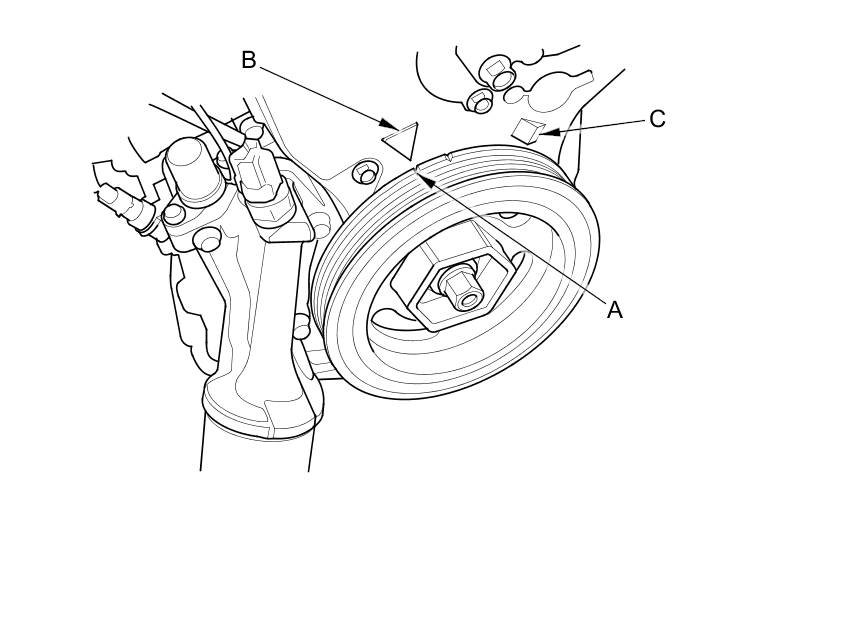 15. Turn the crankshaft pulley so its white mark (A) lines up with the pointer (B).