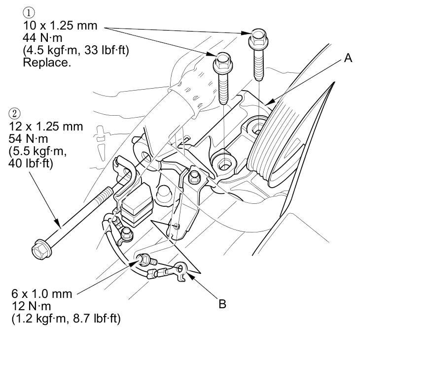 9. Install the lower half of the side engine mount bracket using new bolts (A) and the bolt (B).