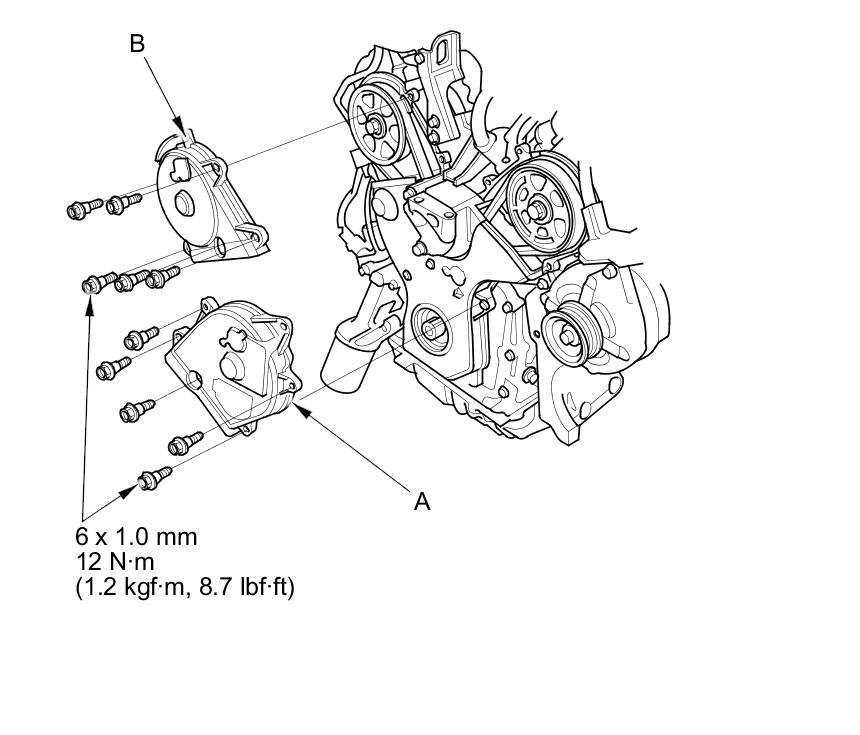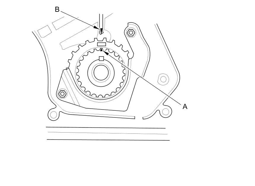 3. Set the timing belt drive pulley to top dead center (TDC) by aligning the TDC mark (A) on the tooth of the timing belt drive pulley with the pointer (B) on the oil pump.