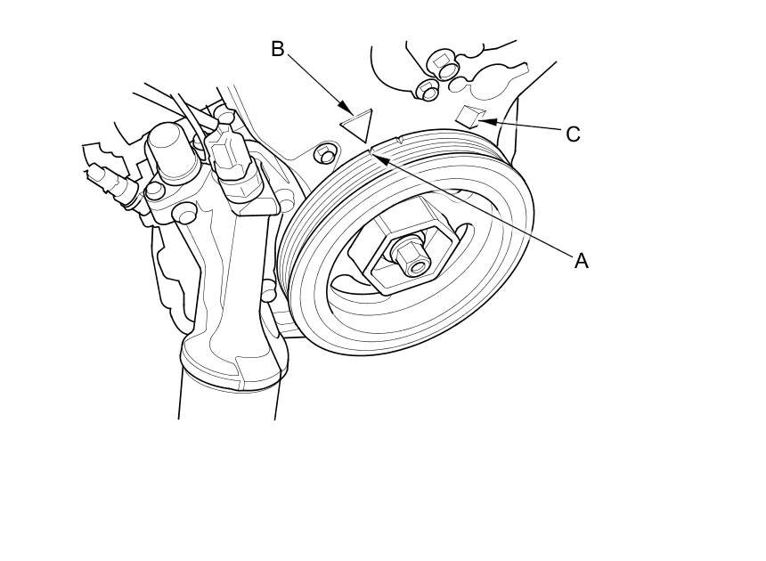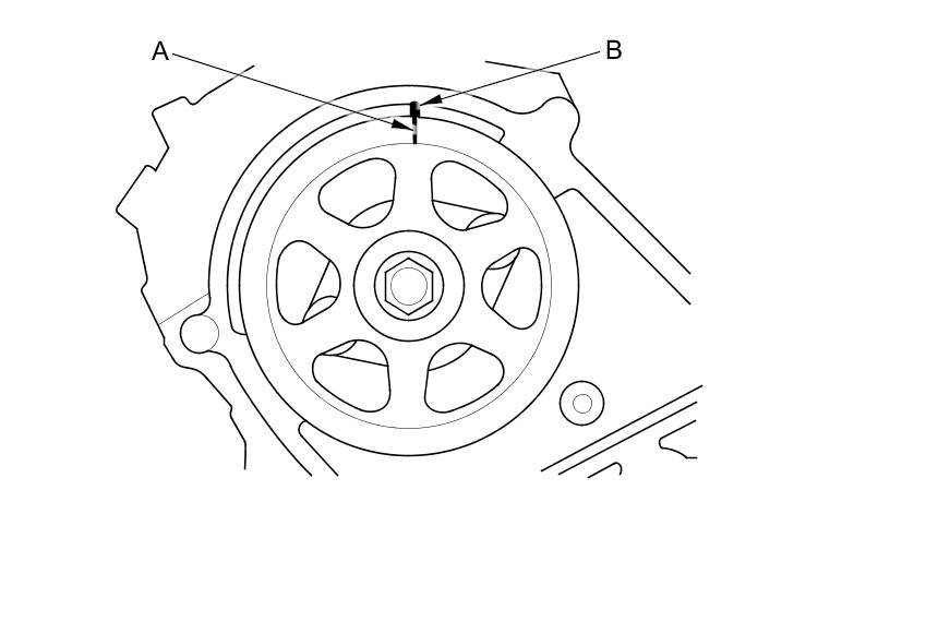 22. Turn the crankshaft pulley so its white mark (A) lines up with the pointer (B).