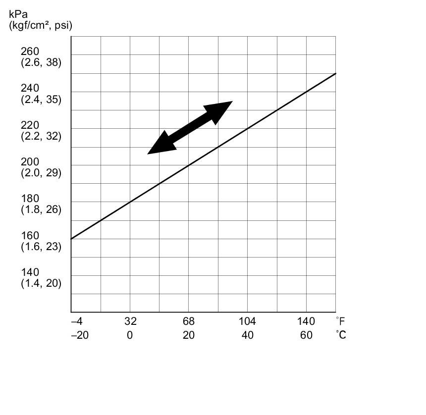 Pressures can also increase or decrease slightly with changes in outside air temperature. A temperature change of about 18 °F (10 °C) will change tire pressure by about 10 kPa (0.1 kgf/cm2, 1.5 psi). If the temperature drops, tire pressure could decrease enough to turn on the low tire pressure indicator and tire indicator(s), but later as tire temperature increases, the tire pressure could increase enough to turn them off. To resolve a complaint of such intermittent indications, confirm and clear the stored DTC(s) and check the tire pressures.