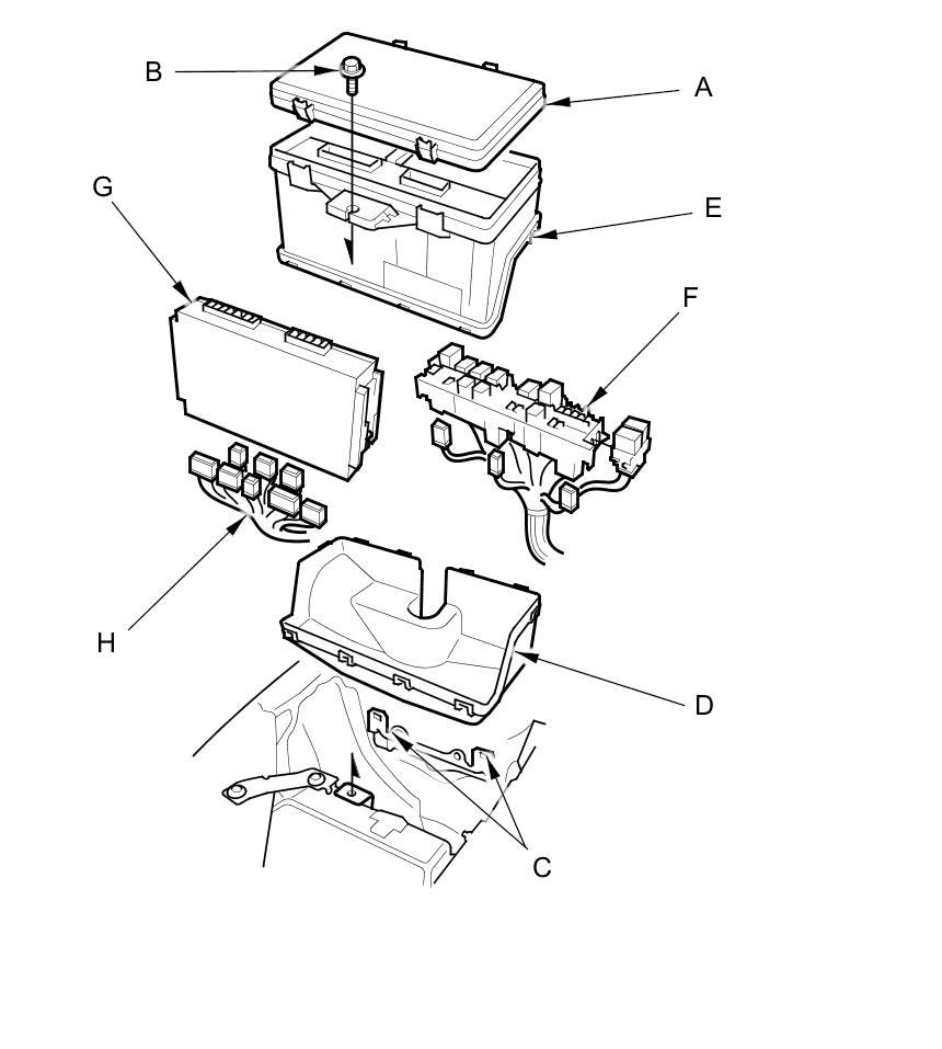 4. Remove the relay block part (F) from the under-hood fuse/relay box.