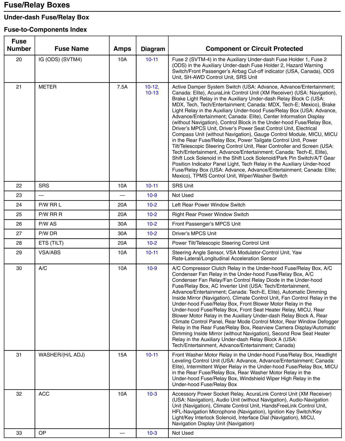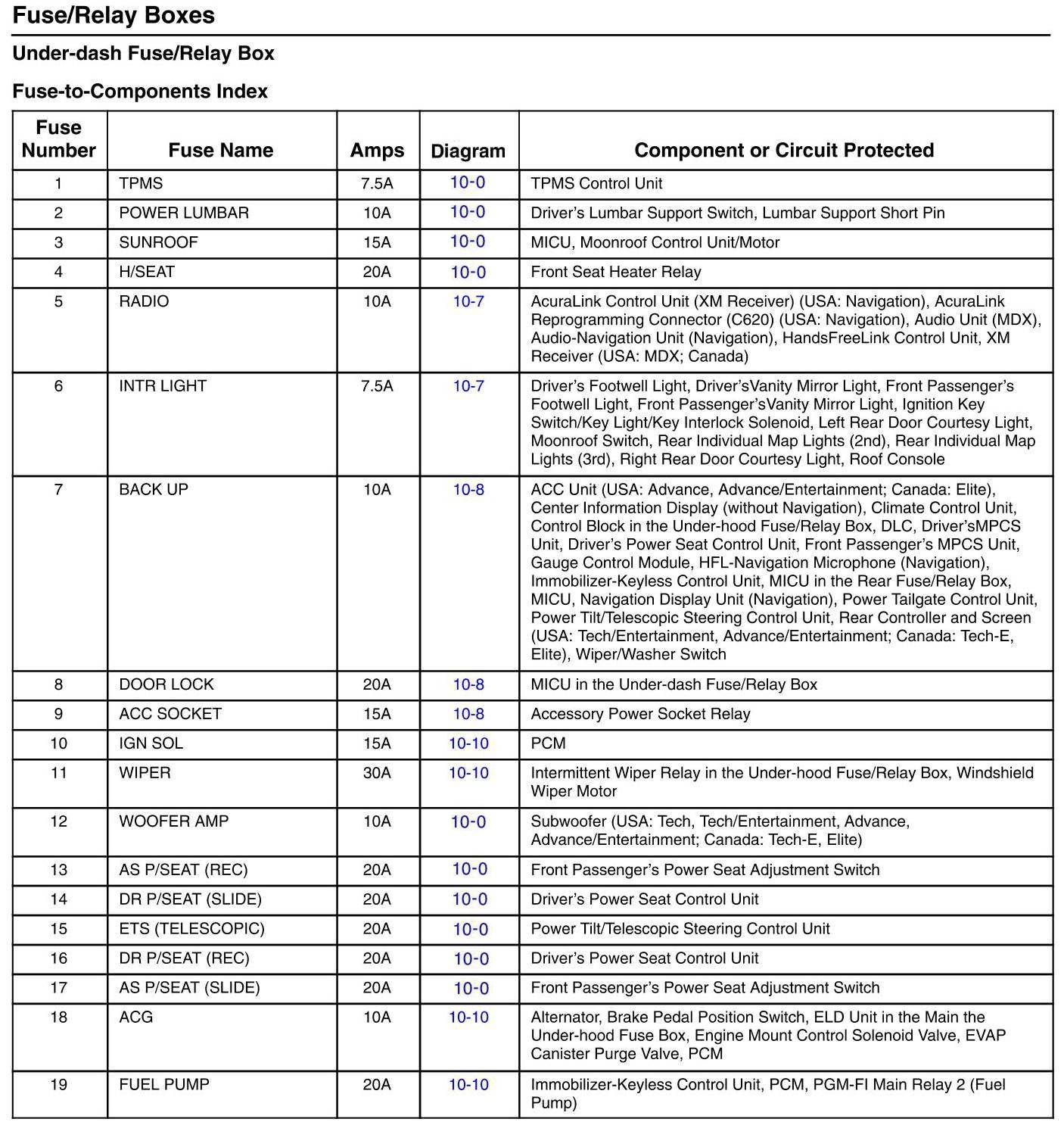 Under-Dash Fuse/Relay Box - Fuse-to-Component Index