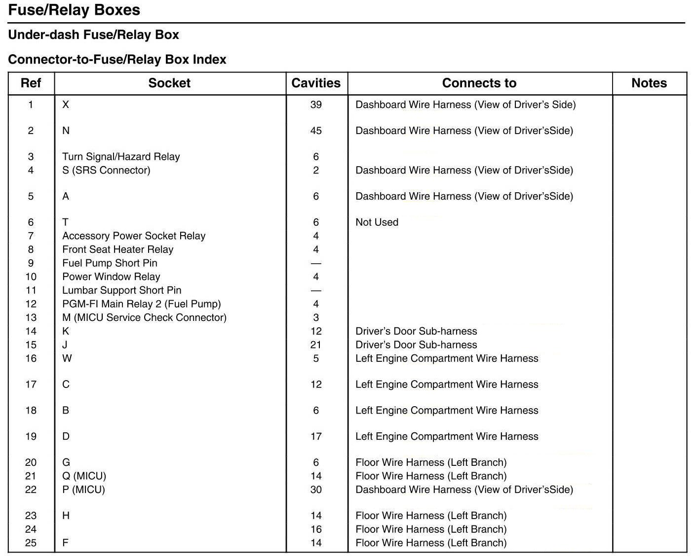 Under-dash Fuse/Relay Box - Connector-to-Fuse/Relay Box Index