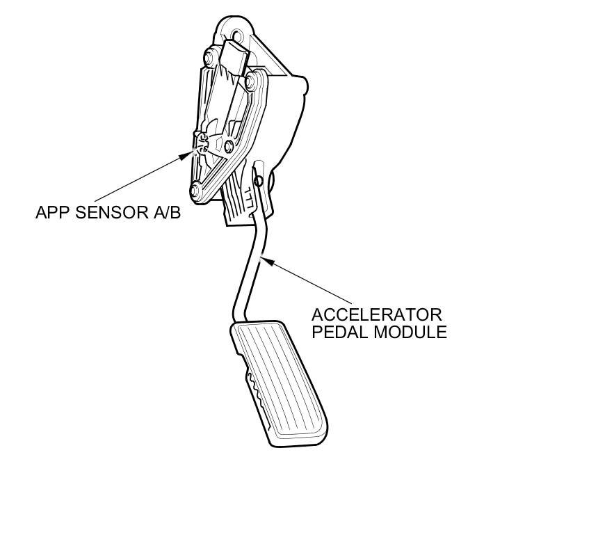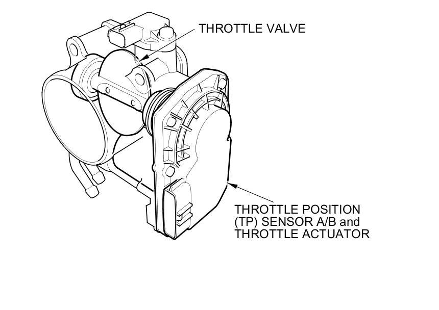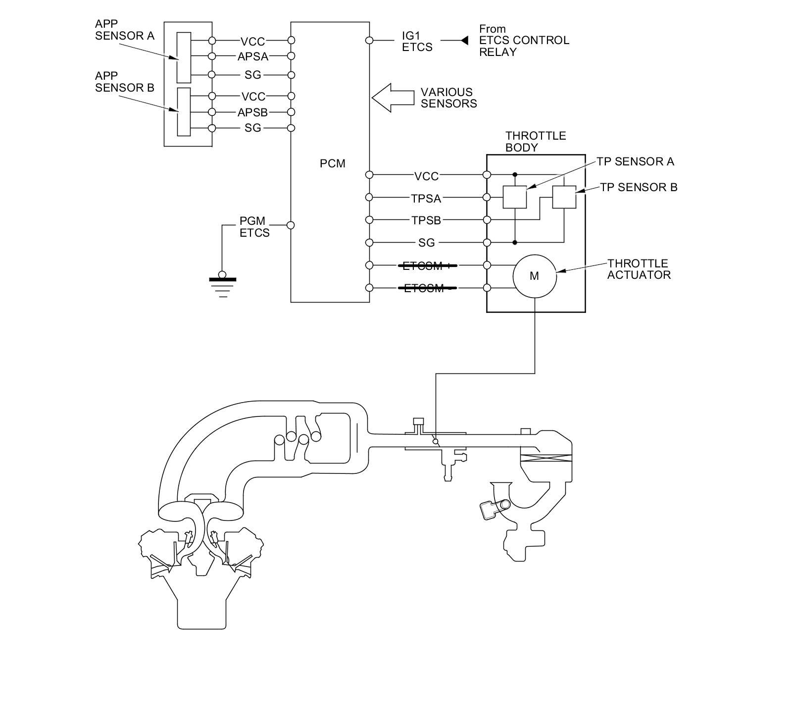The electronic throttle control system consists of the throttle actuator, throttle position (TP) sensor A/B, accelerator pedal position (APP) sensor A/B, the electronic throttle control system (ETCS) control relay, and the PCM.