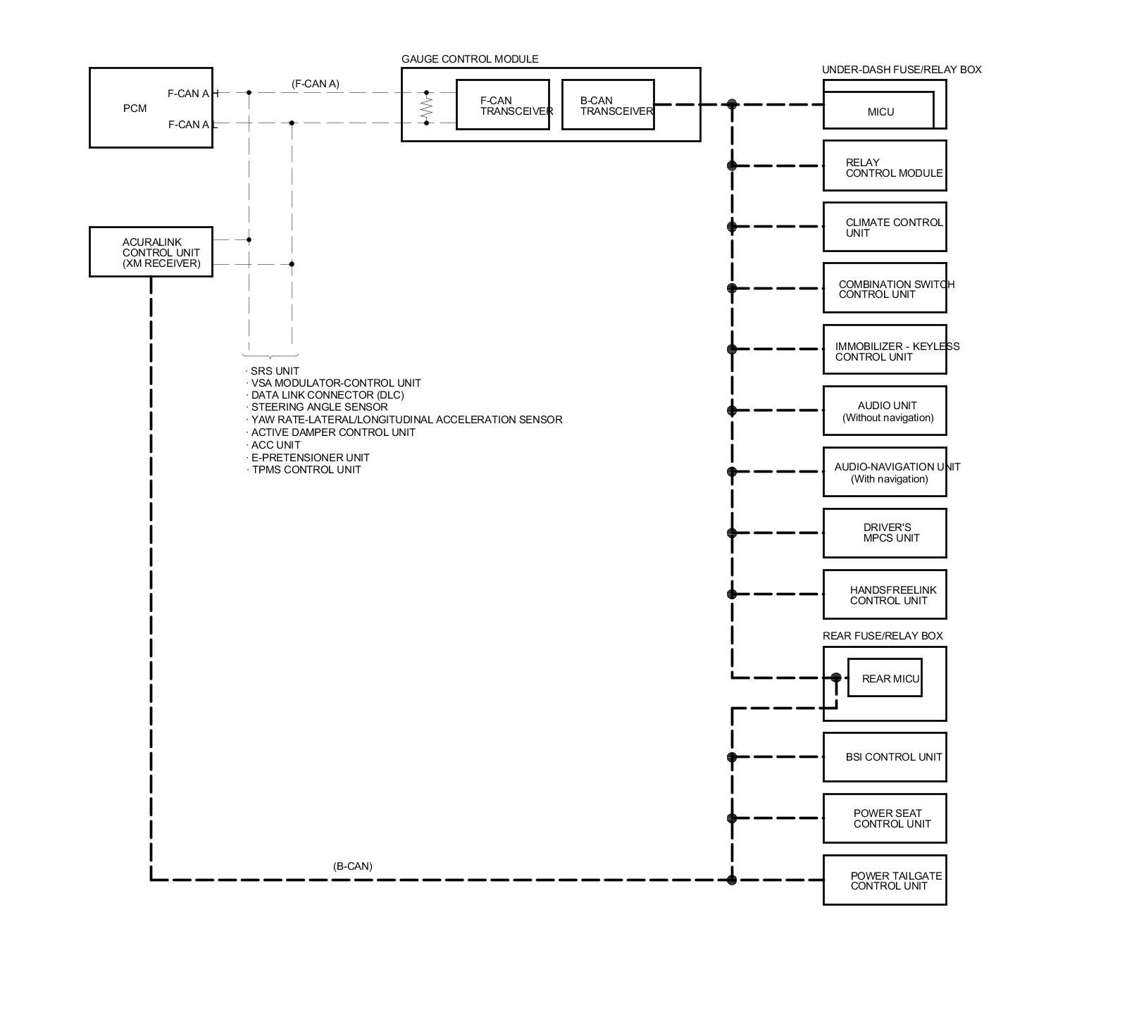 The gauge control module acts as a gateway to allow both systems to share information. The gauge control module translates and relays the information from B-CAN to F-CAN A, and from F-CAN A to B-CAN.