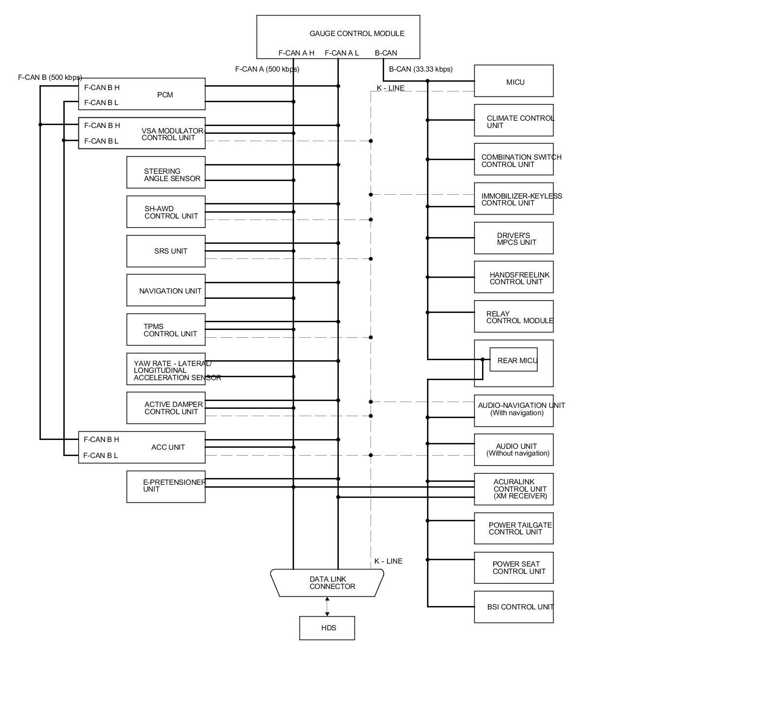 By connecting the HDS to the data link connector (DLC), the HDS can retrieve the diagnostic information from the MICU via a diagnostic BUS called the K-LINE. The K-LINE is a separate communication line that is connected to some of the CAN-related ECUs. The MICU is a gateway between the HDS and B-CAN related ECUs, and sends B-CAN diagnostic information to the HDS. When doing a function test with the HDS, the HDS sends an output signal through the K-LINE to the MICU. The MICU either relays the request to another ECU, or commands the function itself.