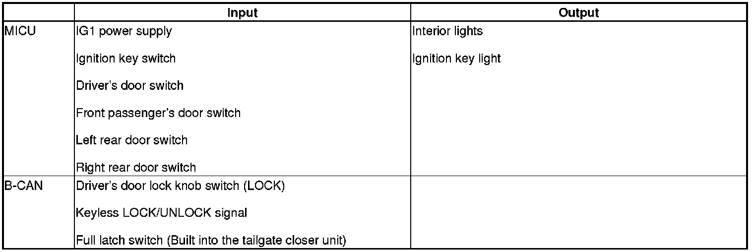 The MICU controls the interior lights and ignition key light ON/OFF based on inputs from each switch.