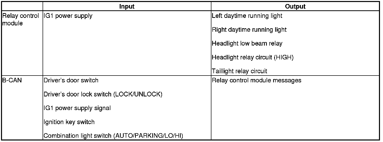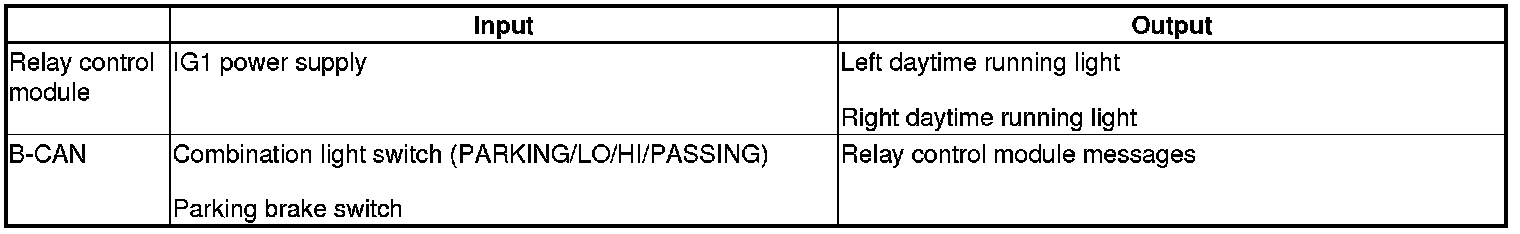 The relay control module controls the daytime running lights based on inputs from each switch.