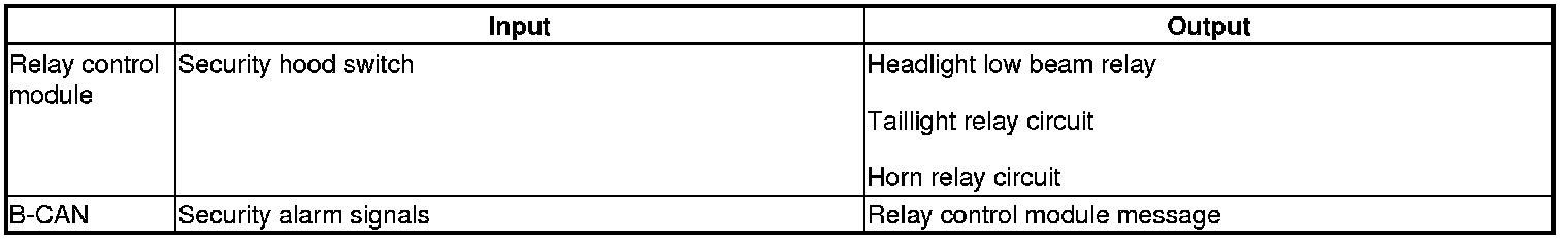 The relay control module controls the security system and the horn based on inputs from the security hood switch.