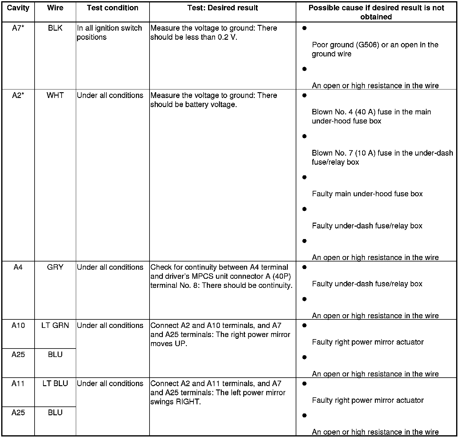 5. Reconnect the connector to the under-dash fuse/relay box, and do the following input tests:
