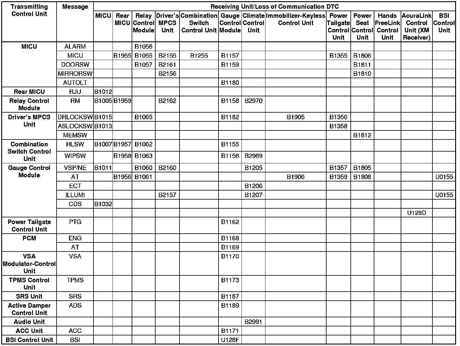 1. Find the Transmitting Control Unit that is in the same row as all of the loss of communication DTCs retrieved.