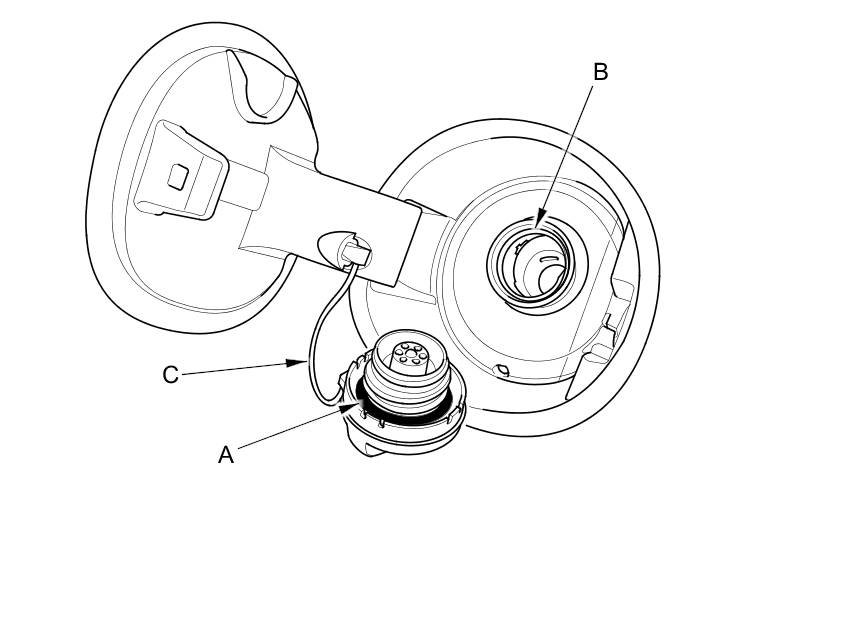 2. Check the fuel fill cap seal (A) and the fuel fill pipe mating surface (B). Verify that the fuel fill cap tether cord (C) is not caught under the cap.