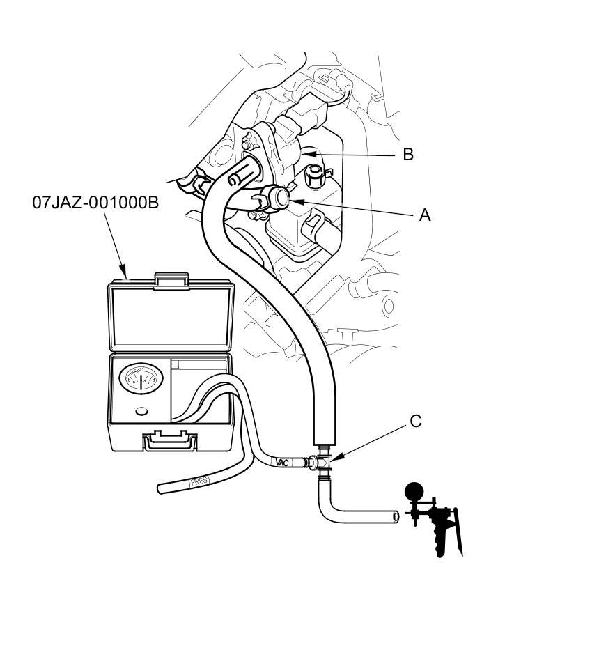 8. Disconnect the vacuum hose (A) from the EVAP canister purge valve (B) in the engine compartment, then connect a T-fitting (C), a vacuum gauge, and a vacuum pump/gauge, 0-30 inHg, to the EVAP canister purge valve as shown.