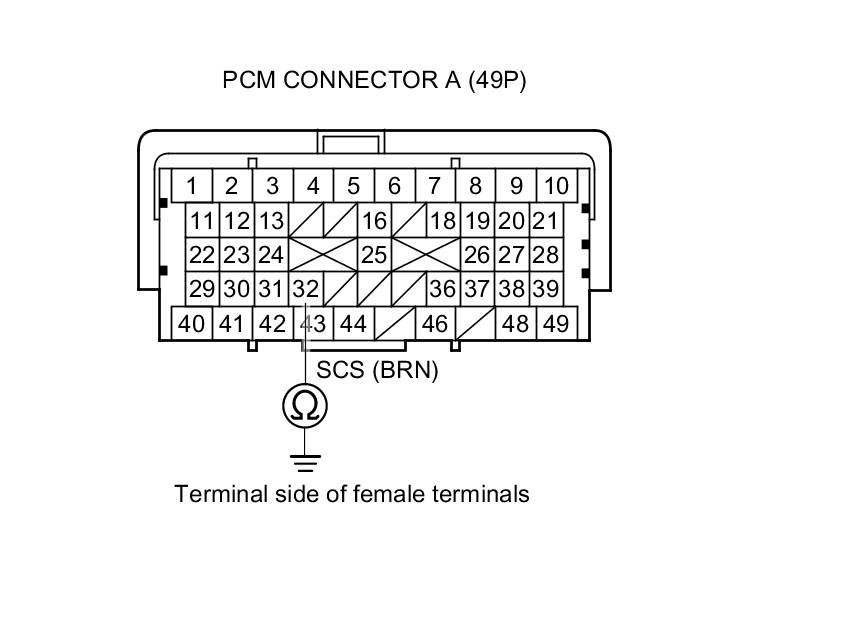 7. Check for continuity between PCM connector terminal A32 and body ground.