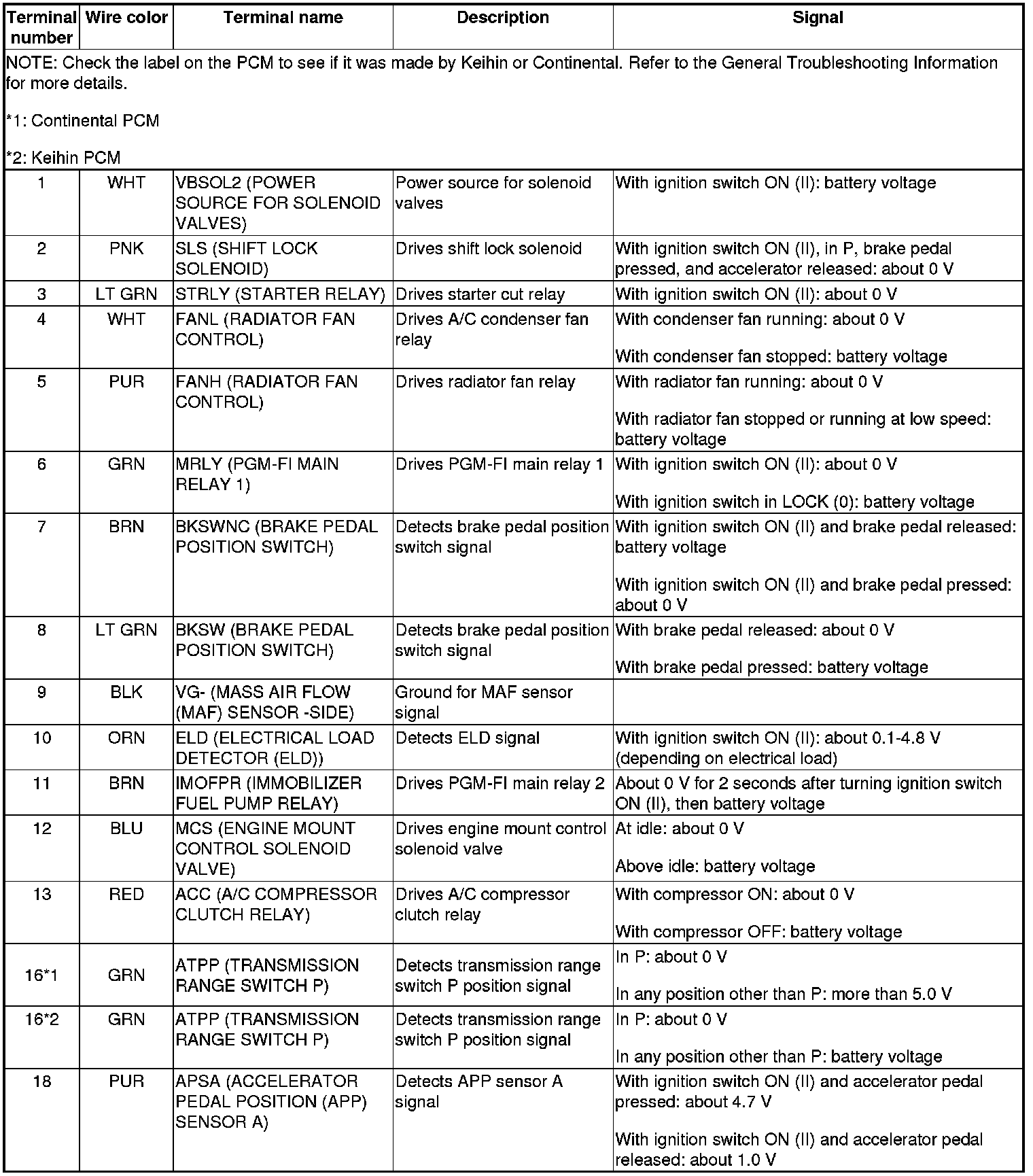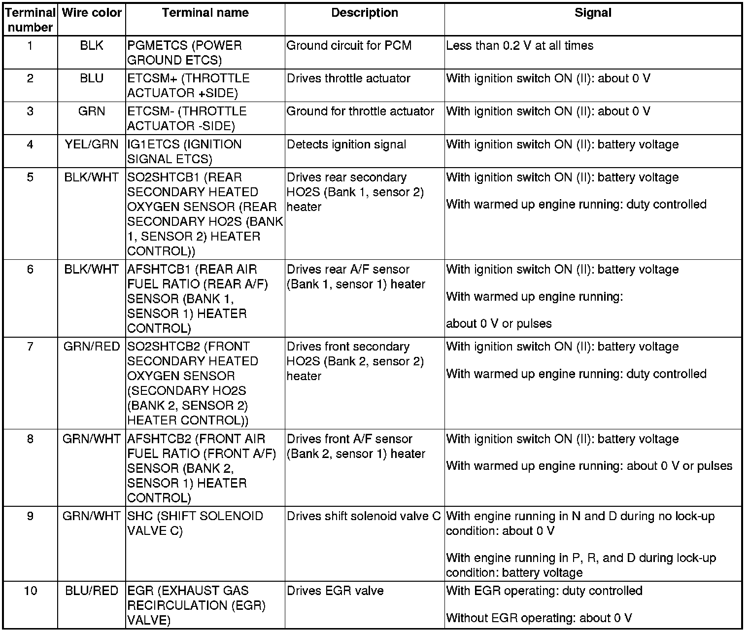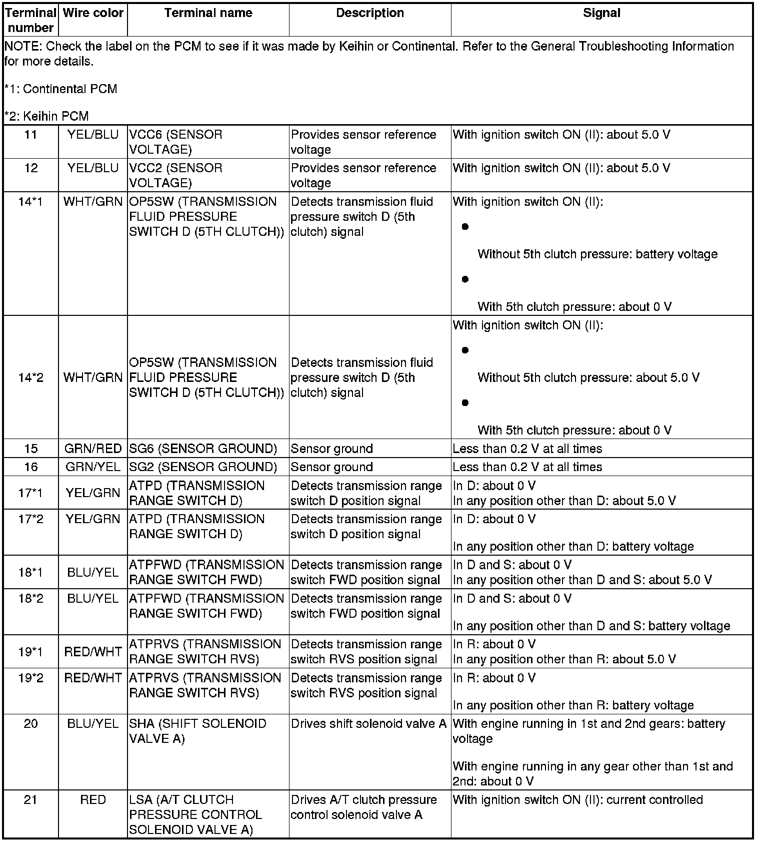 PCM Inputs and Outputs at PCM Connector A (square) (49P)