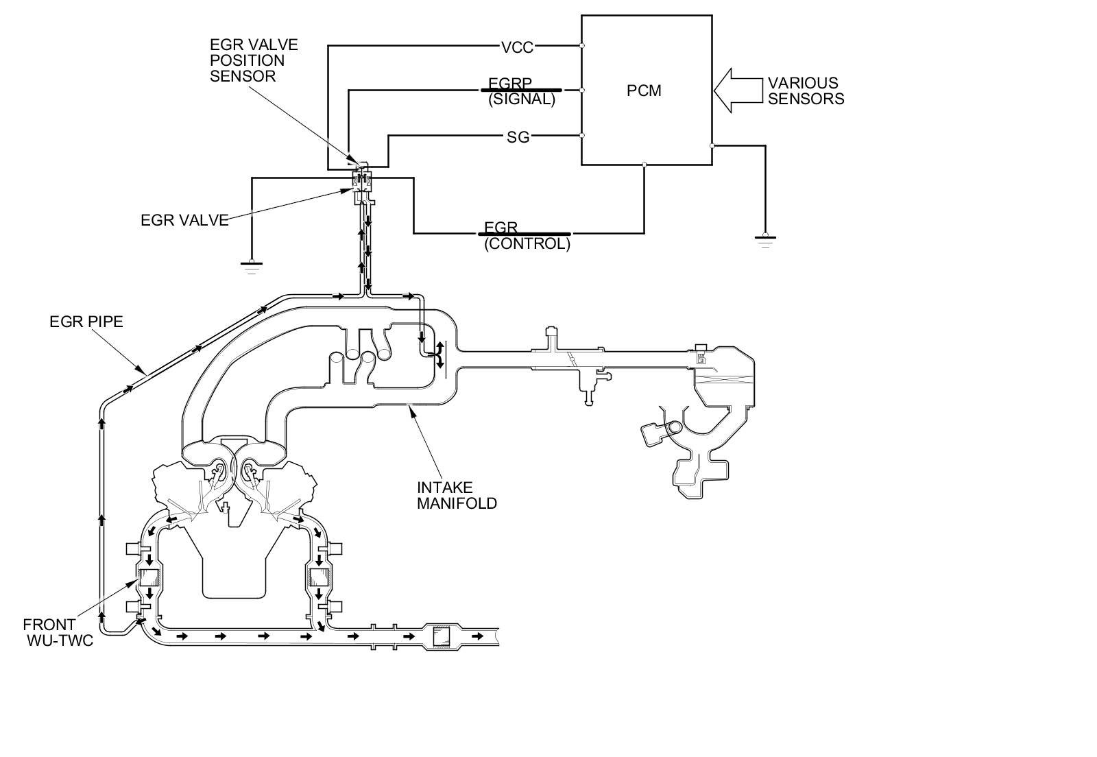 The EGR system reduces oxides of nitrogen (NOx) emissions by recirculating exhaust gas through the EGR pipe and the intake manifold, and into the combustion chambers. Routing the exhaust gas through the EGR pipe helps to prevent carbon deposits from forming in the intake manifold and the throttle body. The PCM maintains the ideal EGR valve positions for various operating conditions.